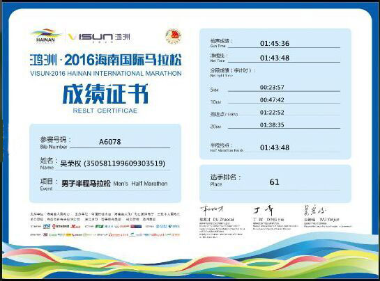 吳榮權(quán)參加2016國際馬拉松大賽成績證書