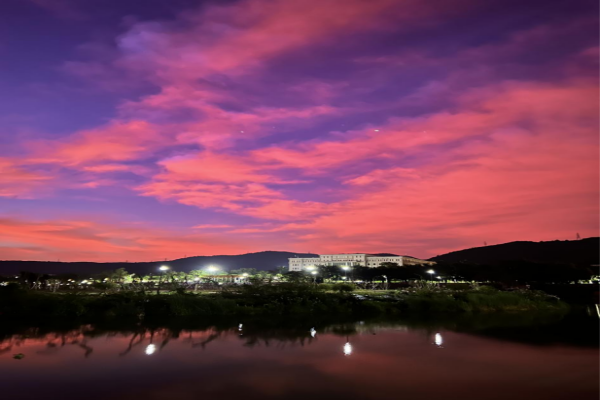 傍晚走在白鷺溪側,一廊橋架于溪上,與遠處的落筆峰交相輝映,橫豎之間,是三亞學院數(shù)不盡的風景,道不完的美麗。這座廊橋仿佛“臥波”于白鷺溪上,與周圍的自然景觀融為一體,形成了一幅絕美的畫卷。站在橋上,可以欣賞到遠處的落筆峰和腳下的清澈溪流,感受到自然與人文的和諧共生。
