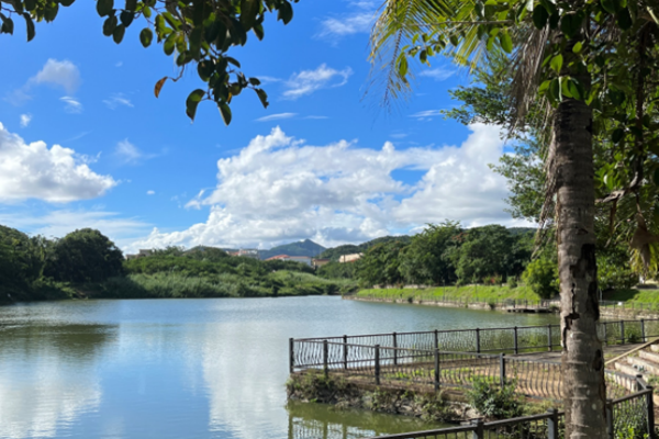 “任憑風浪起,穩(wěn)坐釣魚臺”,坐落于三亞學院凰家云水白鷺溪畔的釣魚臺,掩映在夏蔭中,聽潺潺流水,聞陣陣花香。