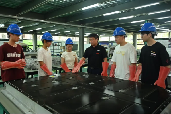 實(shí)驗(yàn)中心內(nèi)現(xiàn)場教學(xué)講解新能源汽車電池構(gòu)造