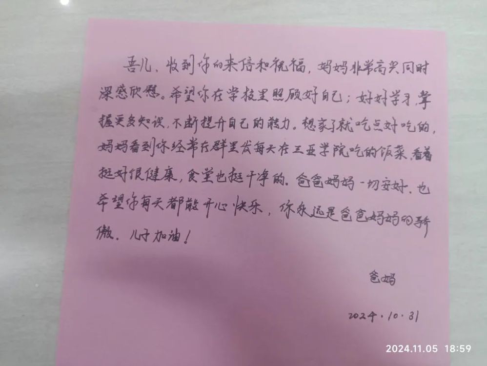 爸媽,我在三亞學院挺好的。宿舍環(huán)境舒適,設施齊全。學校很重視安全,有專人巡邏。還有熱水供應和洗衣機。學校常組織宿舍活動,關懷滿滿。我會珍惜這里的生活,努力學習,你們放心。