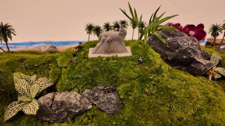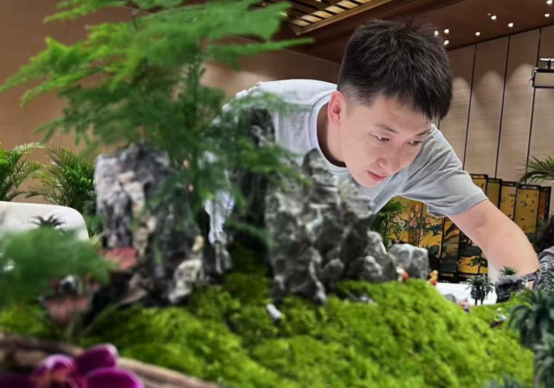 進(jìn)入制作與實(shí)施階段,陳放老師憑借豐富的微景觀設(shè)計(jì)經(jīng)驗(yàn),組織團(tuán)隊(duì)進(jìn)行小樣制作。從地形塑造到植物配置,從水體模擬到景觀小品搭建,每個(gè)環(huán)節(jié)都嚴(yán)格遵循設(shè)計(jì)稿要求。在小樣制作過(guò)程中不斷調(diào)整優(yōu)化,為大規(guī)模制作提供實(shí)踐依據(jù),并根據(jù)現(xiàn)場(chǎng)光線、空間條件靈活調(diào)整。于晨、林意深老師負(fù)責(zé)山脈、水體、動(dòng)物雕塑等關(guān)鍵景觀元素雕琢,以精湛雕塑技藝賦予作品生命力。