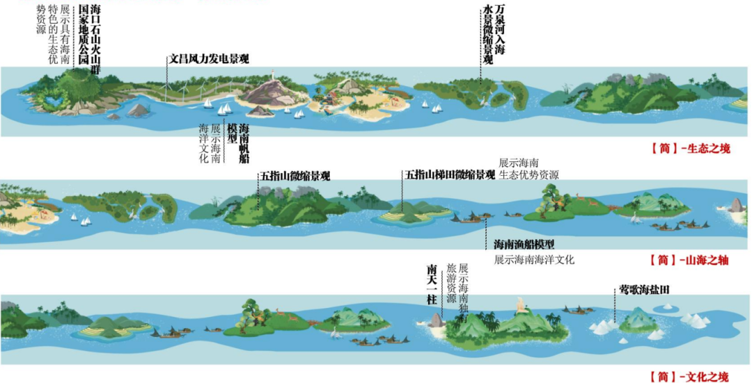 “兩境” 分別為文化之境與生態(tài)之境。文化之境深入挖掘海南本土豐富的地域文化,從充滿傳奇色彩的黎族民間故事,到歷史悠久的海南鹽田傳統(tǒng)勞作技藝,再到底蘊(yùn)深厚的特色茶文化等,將海南人民的智慧與情感融入其中,全方位展現(xiàn)亞洲文化的多元包容。生態(tài)之境以海南廣袤熱帶雨林為依托,豐富的珍稀動(dòng)植物在此棲息,是海南生態(tài)活力的體現(xiàn),也象征著亞洲蓬勃發(fā)展與可持續(xù)追求,寓意亞洲各國(guó)以自然為紐帶、文化為橋梁,在世界變局中于經(jīng)濟(jì)、文化、生態(tài)多方面共生共贏。