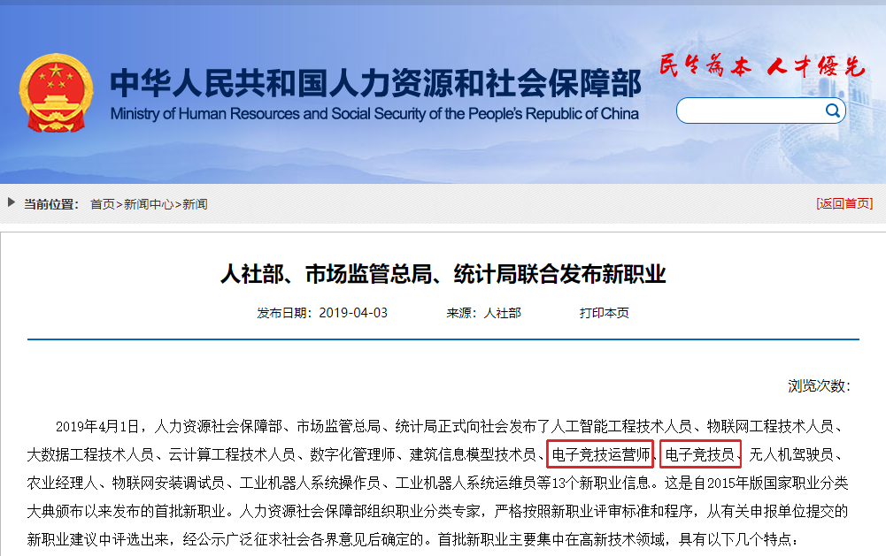 2019年人力資源和社會(huì)保障部等三部委發(fā)布了13個(gè)新職業(yè)其中包括“電子競技運(yùn)營師”和“電子競技員”。