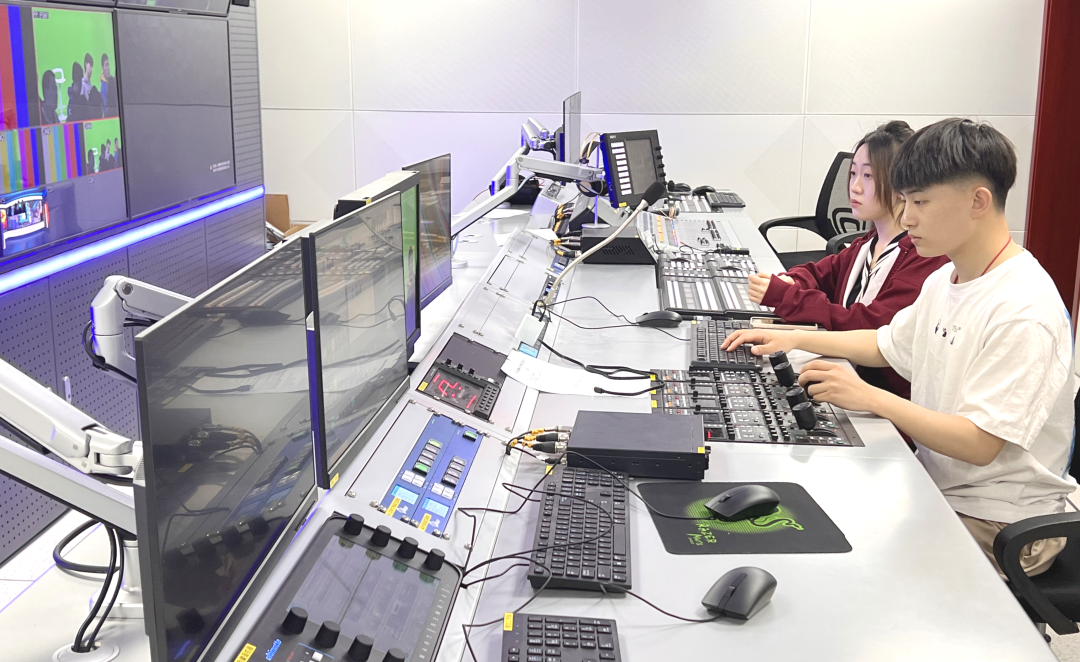 同學(xué)們在學(xué)校打造的超高清演播實(shí)訓(xùn)中心操作導(dǎo)播設(shè)備。