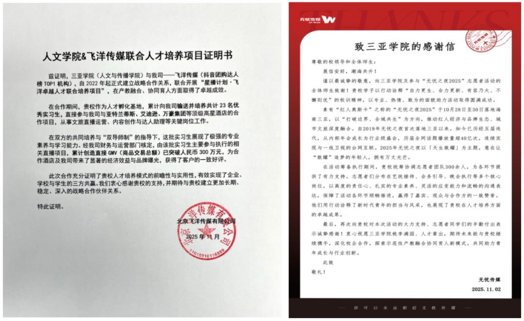 飛洋傳媒聯(lián)合項(xiàng)目培養(yǎng)證明書及感謝信