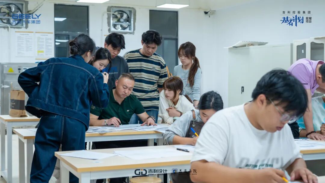這場“塑型攻堅戰(zhàn)”徹底進入白熱化階段,油泥實驗室的燈光幾乎每晚都亮到深夜。吉利設計導師開啟高強度一對一指導模式,針對每個模型的短板逐一突破:這邊剛剛調(diào)整完車頭的俯沖姿態(tài),那邊又馬不停蹄優(yōu)化車尾的圓潤弧度;更關鍵的是,油泥模型的每一處改動,都需要同步反饋到圖紙上進行二次同步調(diào)整,這種“模型與圖紙雙向校準”的實戰(zhàn)模式,讓學子們真切感受到了產(chǎn)業(yè)設計的嚴謹與專業(yè)。校企導師團隊與學子們早已不分彼此,白天一起打磨模型、修改圖紙,不放過任何一個細節(jié);晚上圍坐在一起復盤問題、優(yōu)化方案,哪怕疲憊不堪,眼里也滿是對完美的追求。反復的推倒重來沒有磨掉大家的斗志,反而讓每個人都更加堅定——唯有在實戰(zhàn)中反復打磨,才能交出真正經(jīng)得起產(chǎn)業(yè)檢驗的作品。