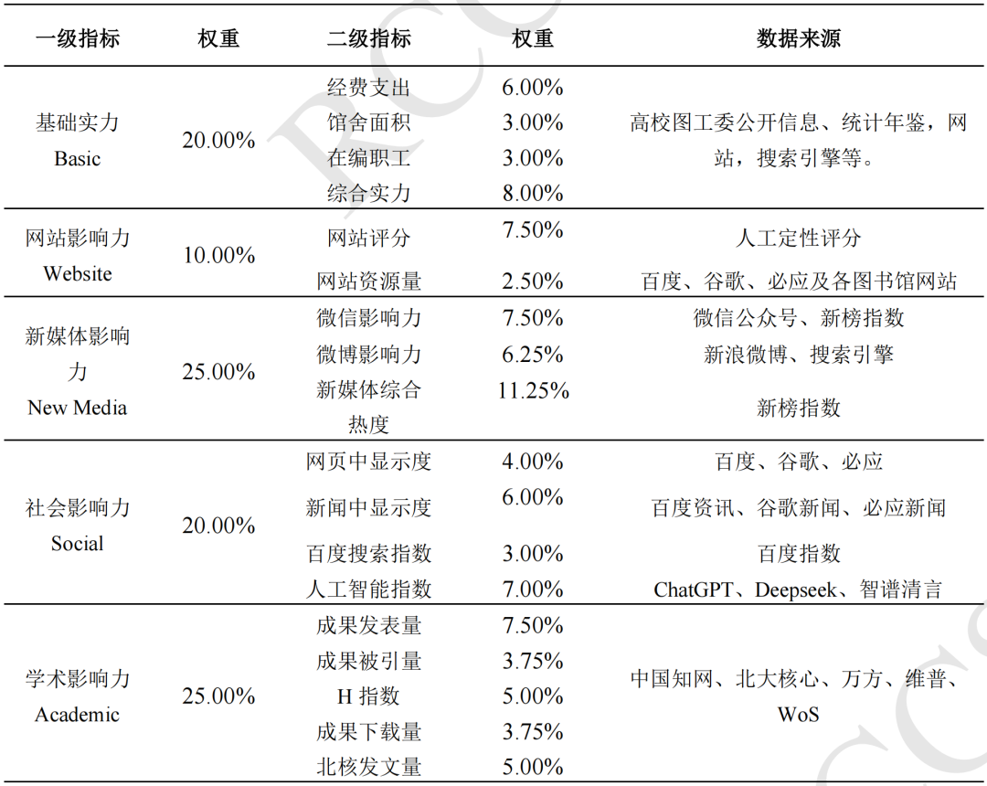 《數智時代中國圖書館影響力指數報告(2025版)》秉承“分類評價、同類比較”原則,根據數智時代圖書館影響力的構成,基于“基礎實力、網站影響力、新媒體影響力、社會影響力、學術影響力”五維一體的評估模型,通過多源數據采集、多輪人工校驗與交叉檢驗,對全國2919所高校圖書館、1980所公共圖書館及390所專業(yè)圖書館進行了系統(tǒng)評估。報告在數據獲取、指標構建與結果分析中,堅持公開、透明、穩(wěn)健的方法,具有較高的科學性、可比性、權威性與參考價值。