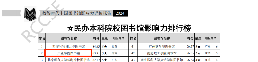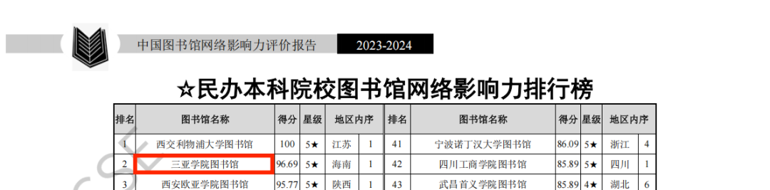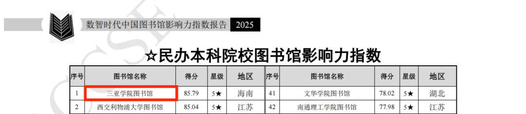 日前,由武漢大學中國科學評價研究中心、數字出版智能服務技術教育部工程研究中心聯(lián)合研究制作的《數智時代中國圖書館影響力指數報告(2025版)》正式發(fā)布。在本次評估中,三亞學院圖書館表現卓越,榮獲全國民辦本科院校圖書館影響力指數排行榜第一名,并連續(xù)三年獲評五星級圖書館(5★為具有突出影響力的單位,即排在最前面10%的單位)。