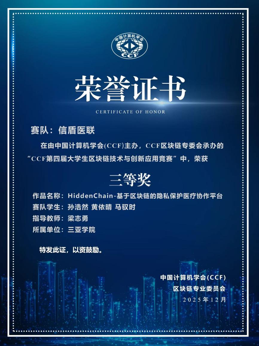 據(jù)悉,信息與智能工程學院“信盾醫(yī)聯(lián)”賽隊由孫浩然、黃依晴、馬馭時三位學生組成,在梁志勇老師的指導下,圍繞醫(yī)療數(shù)據(jù)隱私保護與跨機構(gòu)協(xié)作的行業(yè)痛點,設計了基于區(qū)塊鏈技術(shù)的醫(yī)療協(xié)作平臺,為醫(yī)療行業(yè)的數(shù)字化協(xié)作提供了創(chuàng)新解決方案。此次獲獎,不僅是對學生技術(shù)創(chuàng)新能力與實踐應用水平的肯定,也體現(xiàn)了學院在區(qū)塊鏈領(lǐng)域的人才培養(yǎng)成效。未來,學院將繼續(xù)鼓勵學生深耕技術(shù)創(chuàng)新,在專業(yè)領(lǐng)域?qū)崿F(xiàn)高質(zhì)量成長。