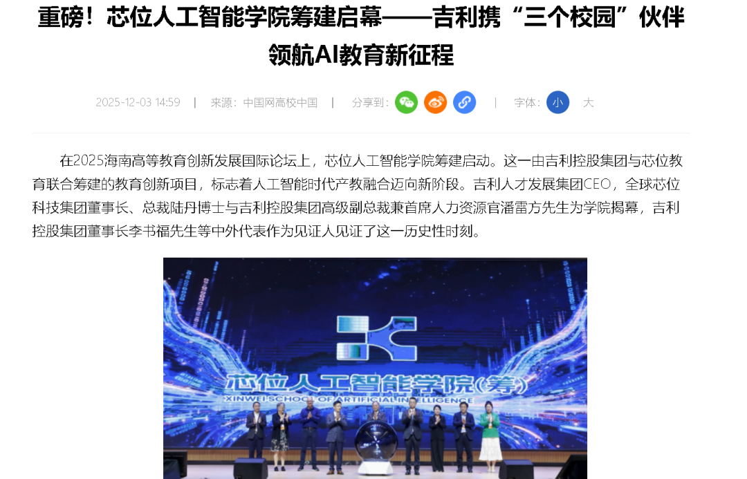 2025海南高等教育創(chuàng)新發(fā)展國際論壇上,由吉利控股集團(tuán)與芯位教育聯(lián)合籌建的芯位人工智能學(xué)院正式啟動(dòng)籌建,陸丹博士與潘雷方先生為學(xué)院揭幕,李書福先生等中外代表見證。學(xué)院秉持產(chǎn)教融合理念,依托吉利產(chǎn)業(yè)積累培養(yǎng)實(shí)用型AI人才,創(chuàng)新打造“基礎(chǔ)校園+流動(dòng)校園+智慧平臺(tái)”辦學(xué)模式,踐行“未來大學(xué)當(dāng)坐在AI上”理念,構(gòu)建虛實(shí)融合的全景式未來大學(xué),下設(shè)多類教研及孵化分支機(jī)構(gòu)并設(shè)吉利博士后流動(dòng)站。該學(xué)院的籌建是吉利教育領(lǐng)域長期布局的重要里程碑,將推動(dòng)產(chǎn)教深度融合,探索人工智能時(shí)代高等教育新范式。