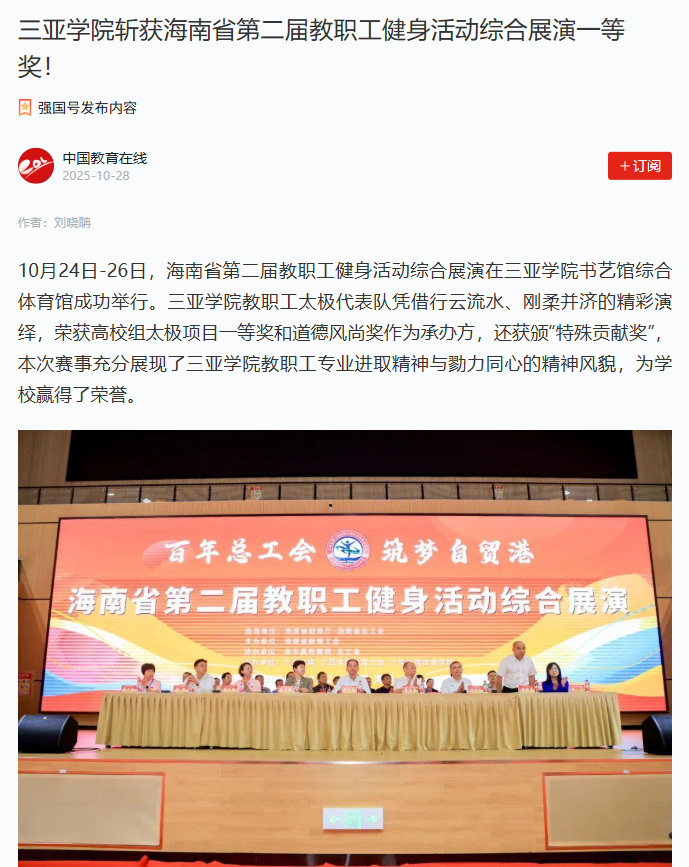 三亞學(xué)院成功承辦海南省第二屆教職工健身活動(dòng)綜合展演,其教職工太極代表隊(duì)榮獲高校組太極項(xiàng)目一等獎(jiǎng)及道德風(fēng)尚獎(jiǎng)。學(xué)校通過“以賽育人”模式,將賽事組織與專業(yè)教學(xué)深度融合,為學(xué)生提供實(shí)踐鍛煉平臺(tái)。此次獲獎(jiǎng)?wù)宫F(xiàn)了學(xué)校在推動(dòng)校園文化建設(shè)和踐行產(chǎn)教融合戰(zhàn)略方面取得的積極成果。