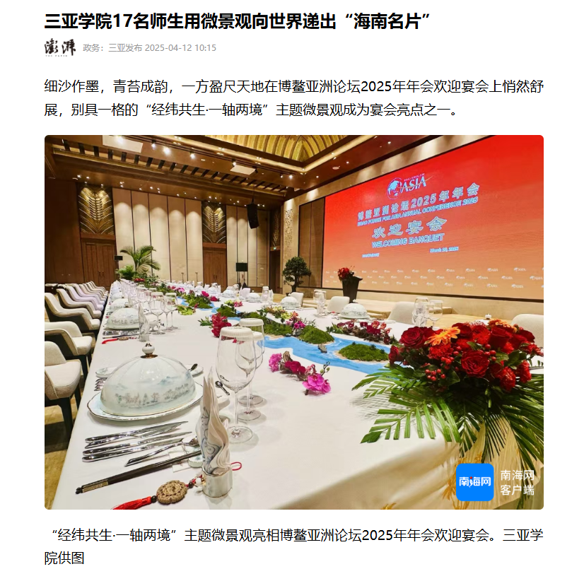 三亞學(xué)院藝術(shù)學(xué)院17名師生為博鰲亞洲論壇2025年年會(huì)創(chuàng)作了主題微景觀“經(jīng)緯共生·一軸兩境”。作品歷時(shí)96小時(shí),在不足10平方米的空間內(nèi)巧妙融合五指山、三江入海等13處海南地標(biāo),生動(dòng)展現(xiàn)了海南的自然與人文特色。該項(xiàng)目體現(xiàn)了學(xué)院產(chǎn)教融合的成果,師生們通過藝術(shù)實(shí)踐向世界遞出了生動(dòng)的“海南名片”。