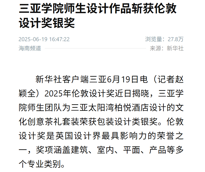 三亞學(xué)院師生團(tuán)隊(duì)為三亞太陽灣柏悅酒店設(shè)計(jì)的文化創(chuàng)意茶禮套裝榮獲2025年倫敦設(shè)計(jì)獎(jiǎng)包裝設(shè)計(jì)類銀獎(jiǎng)。該作品融合海南茶文化與黎族傳統(tǒng)紋樣,以現(xiàn)代設(shè)計(jì)語言展現(xiàn)東方美學(xué)。此次獲獎(jiǎng)體現(xiàn)了學(xué)校產(chǎn)教融合的成果,是海南文化通過設(shè)計(jì)創(chuàng)新走向國際舞臺(tái)的成功實(shí)踐。