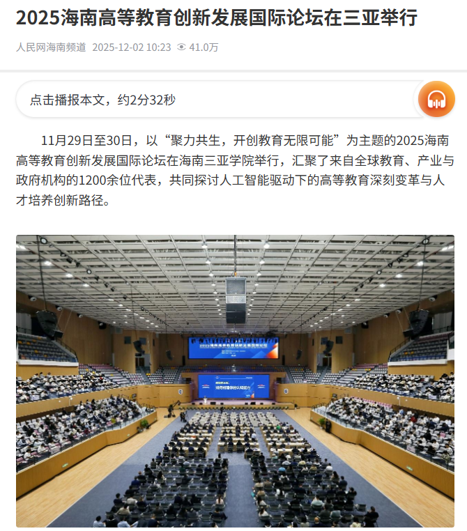 在2025海南高等教育創(chuàng)新發(fā)展國際論壇中,三亞學(xué)院以其前瞻性的教學(xué)創(chuàng)新與改革舉措,成為本次論壇的焦點(diǎn)之一。本次論壇以“AI賦能 聚力共生”為主題,契合了三亞學(xué)院通過一系列教學(xué)創(chuàng)新實(shí)踐,詮釋了“將大學(xué)坐在AI上,讓教育開創(chuàng)無限可能”的創(chuàng)新育人理念。