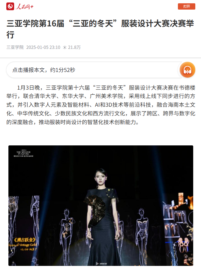三亞學(xué)院第十六屆“三亞的冬天”服裝設(shè)計(jì)大賽決賽近日舉行,大賽聯(lián)合多所高校,引入數(shù)字人、AI與3D等前沿科技,融合多元文化元素。28組學(xué)生作品圍繞民族、時(shí)尚等主題展開,最終《溯古躍金》憑借獨(dú)特設(shè)計(jì)榮獲一等獎(jiǎng)。賽事展現(xiàn)了服裝設(shè)計(jì)的數(shù)字化創(chuàng)新趨勢,旨在培養(yǎng)新時(shí)代服裝設(shè)計(jì)人才。