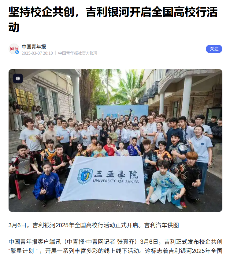 吉利銀河近日正式啟動(dòng)2025年全國高校行活動(dòng),并發(fā)布校企共創(chuàng)“繁星計(jì)劃”?;顒?dòng)以大學(xué)生新媒體共創(chuàng)大賽和校園見面會(huì)等形式展開,邀請奧運(yùn)冠軍黃雨婷等與三亞學(xué)院學(xué)子互動(dòng)交流,旨在為年輕人搭建展示才華、連接企業(yè)的平臺(tái)。吉利長期致力于產(chǎn)教融合,已在全國投資創(chuàng)辦多所高校,持續(xù)推動(dòng)教育鏈與產(chǎn)業(yè)鏈的深度銜接。