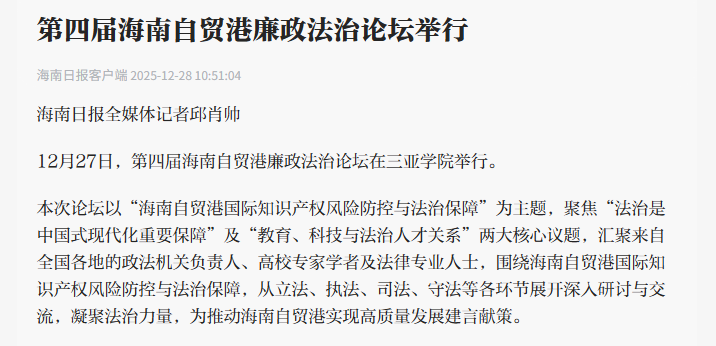 第四屆海南自貿(mào)港廉政法治論壇在三亞學(xué)院舉行。論壇以“海南自貿(mào)港國際知識(shí)產(chǎn)權(quán)風(fēng)險(xiǎn)防控與法治保障”為主題,聚焦“法治是中國式現(xiàn)代化重要保障”及“教育、科技與法治人才關(guān)系”兩大核心議題,圍繞海南自貿(mào)港國際知識(shí)產(chǎn)權(quán)風(fēng)險(xiǎn)防控與法治保障,為推動(dòng)海南自貿(mào)港實(shí)現(xiàn)高質(zhì)量發(fā)展建言獻(xiàn)策。