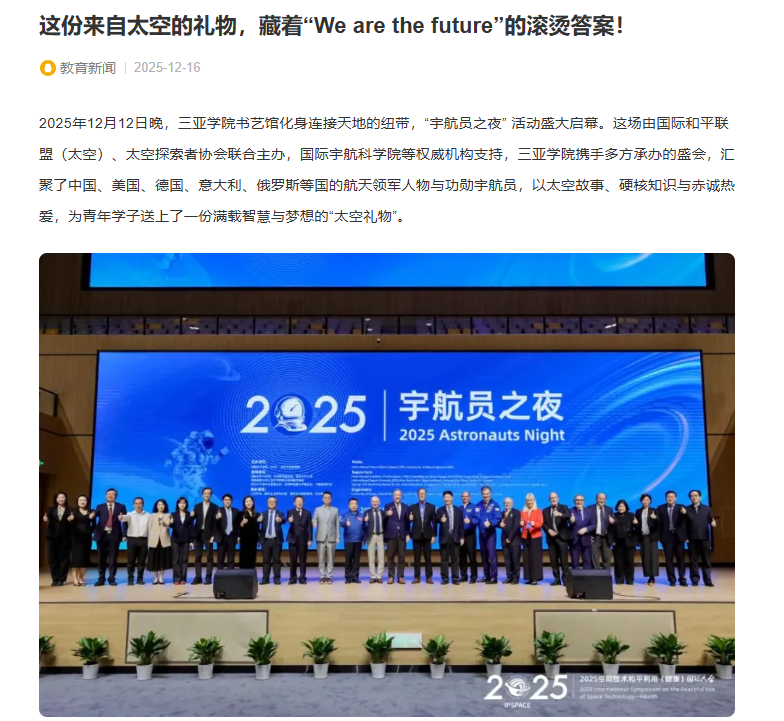 “宇航員之夜”盛大啟幕。多國航天英雄、行業(yè)知名人士跨越山海赴約齊聚,用太空故事、硬核知識(shí)與赤誠熱愛,為大家送上了一份滿載智慧與夢想的“太空禮物”,更以“You are the future”的信念,點(diǎn)燃了青年一代的航天夢想,書寫著吉利教育與三亞學(xué)院的社會(huì)擔(dān)當(dāng)。