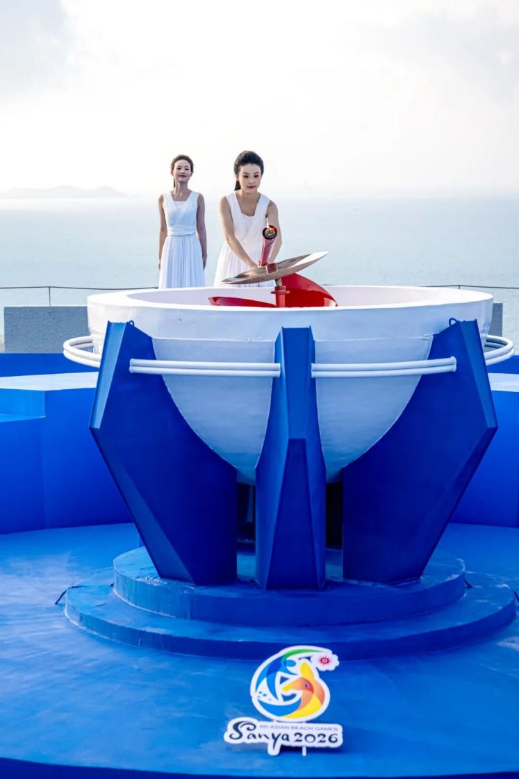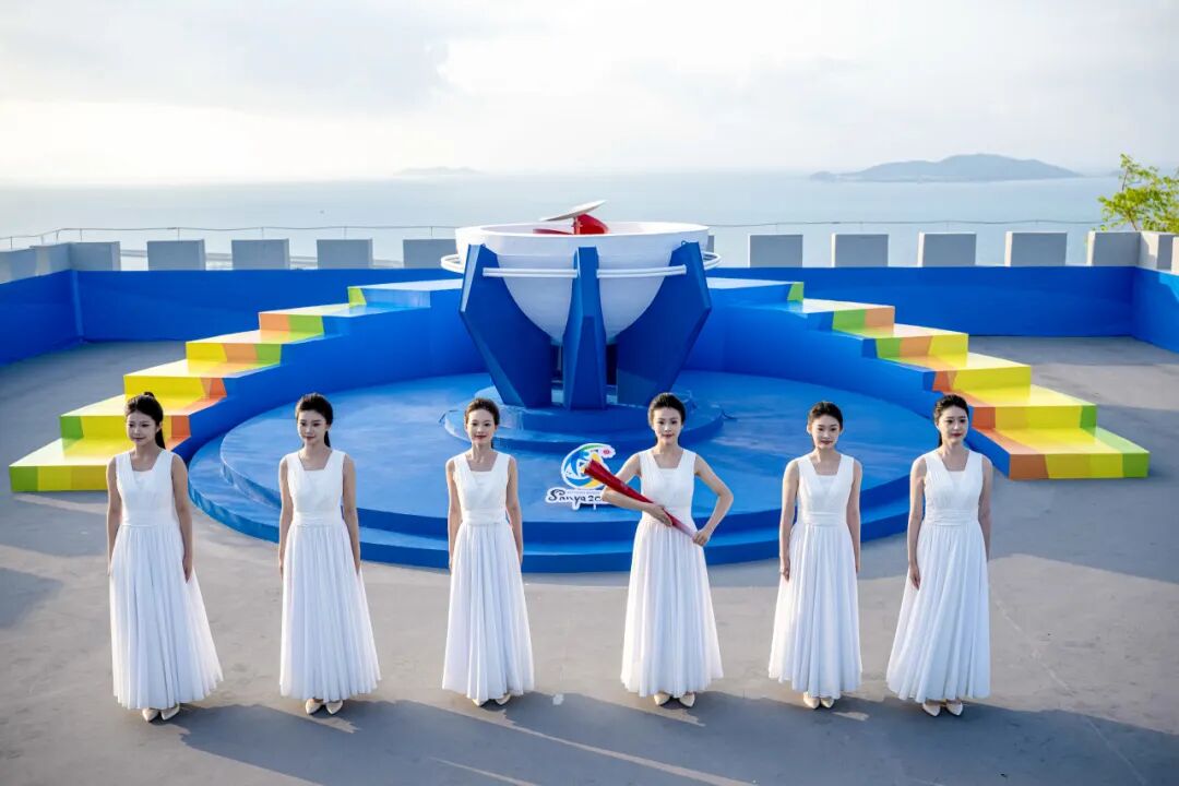 The upper part of the torch draws inspiration from bougainvillea, the city flower of Sanya, creating a three-petal "Feather of Flames" shape that not only accurately captures the flower's vigorous form but also subtly echoes the name "Sanya" (meaning "three coves"). The color scheme features a gradient of "rosy clouds casting their light on the rolling waves", transitioning from golden red at the top to blue and green at the base, with the pure bougainvillea red creating a striking visual against the blue sea and sky.
