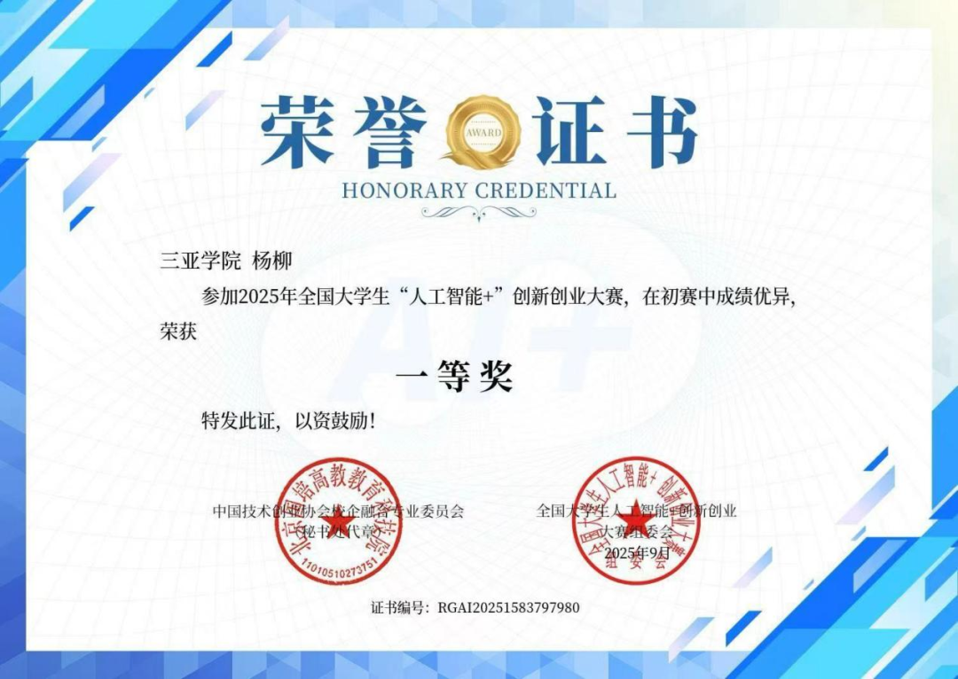 大一入學(xué)時(shí),學(xué)校為她配備了一位學(xué)業(yè)導(dǎo)師。導(dǎo)師發(fā)現(xiàn)她對(duì)金融領(lǐng)域有著濃厚的興趣,便鼓勵(lì)她在會(huì)計(jì)專業(yè)的基礎(chǔ)上,慢慢拓展金融知識(shí),還幫她對(duì)接了企業(yè)資源。在項(xiàng)目制教學(xué)中,她選擇了與金融相關(guān)的創(chuàng)新項(xiàng)目,一路過關(guān)斬將,斬獲第十四屆大學(xué)生“創(chuàng)新創(chuàng)業(yè)及創(chuàng)意”大賽海南省賽區(qū)一等獎(jiǎng)、全國大學(xué)生“人工智能+”創(chuàng)新創(chuàng)業(yè)大賽初賽一等獎(jiǎng)。