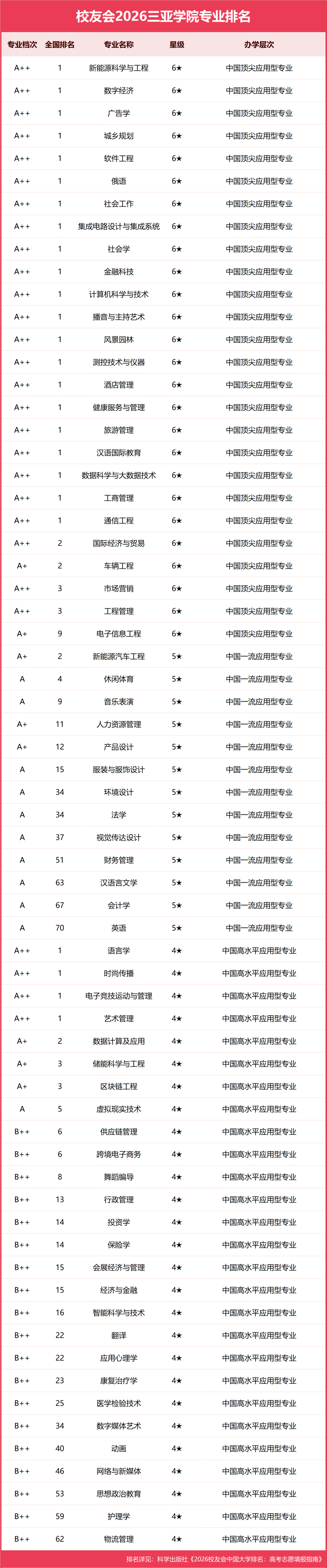 在校友會(huì)2026專(zhuān)業(yè)排名中, 三亞學(xué)院新能源科學(xué)與工程、集成電路設(shè)計(jì)與集成系統(tǒng)、計(jì)算機(jī)科學(xué)與技術(shù)、數(shù)字經(jīng)濟(jì)、社會(huì)工作等26個(gè)專(zhuān)業(yè)榮得2026中國(guó)六星級(jí)應(yīng)用型專(zhuān)業(yè)(6★),位列2026中國(guó)頂尖應(yīng)用型專(zhuān)業(yè)。